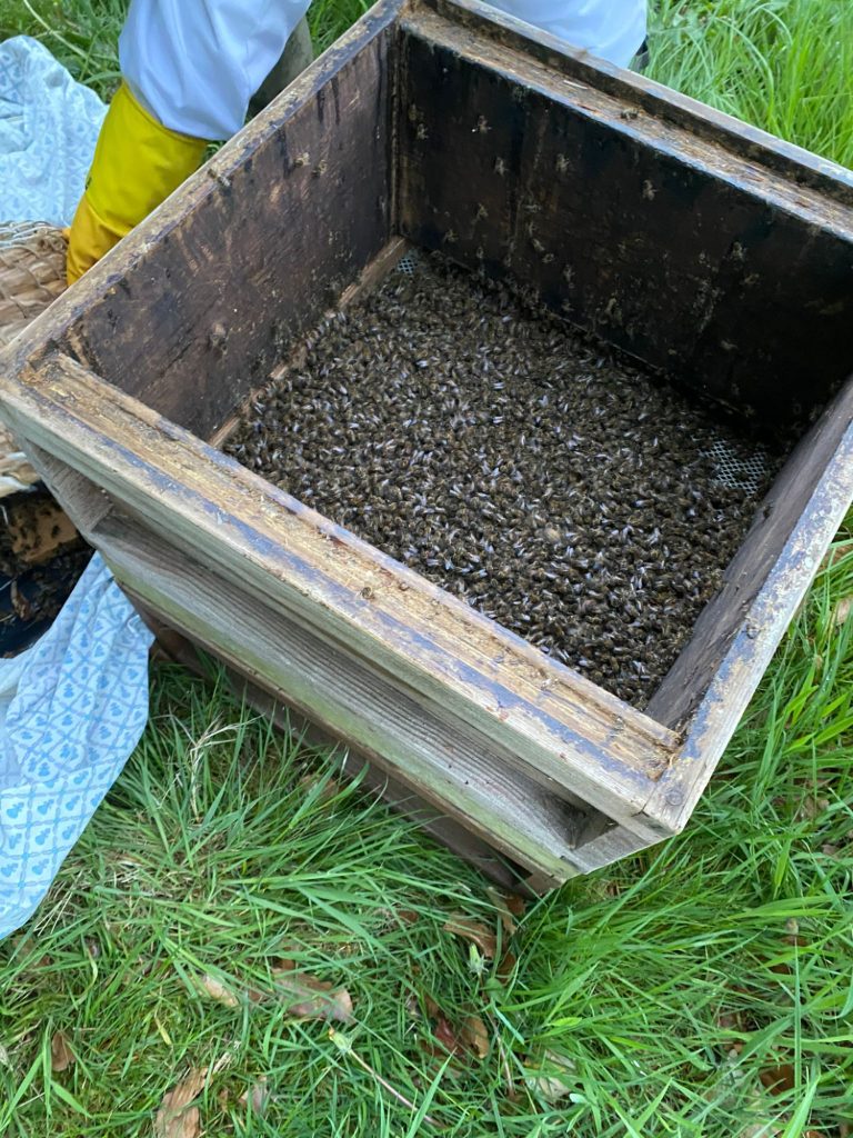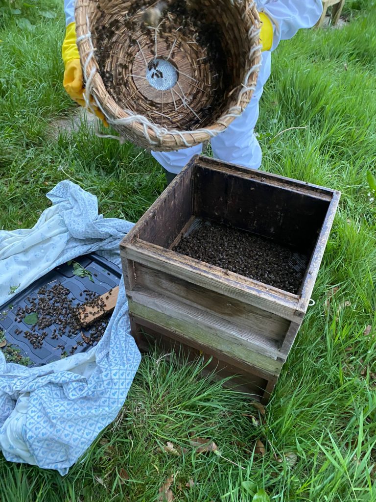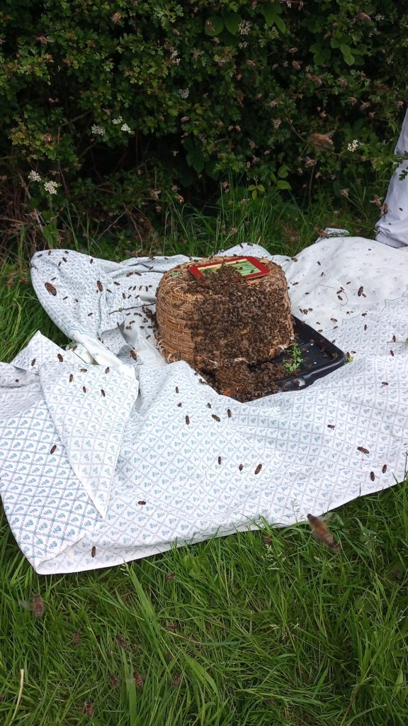 Our beekeeping expert, came and shook the bees into a skep (a type of container). Some of the bees could not be persuaded to go into the skep and were last seen crossing Leeds Road towards the new development!