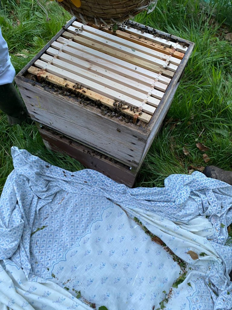 We have assembled a new hive and transferred the bees into it, we are hoping that the new queen is in there as well!