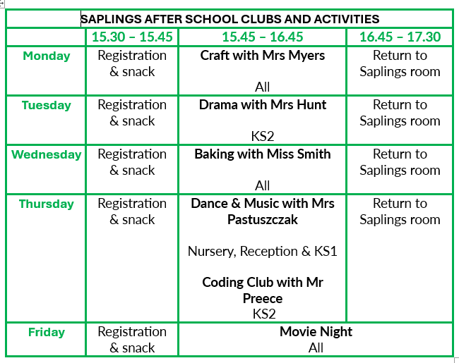 | PM Session – 15.30 – 17.30 | £10.80 | Snack, option of a club & then staying in Saplings until 17.30 |